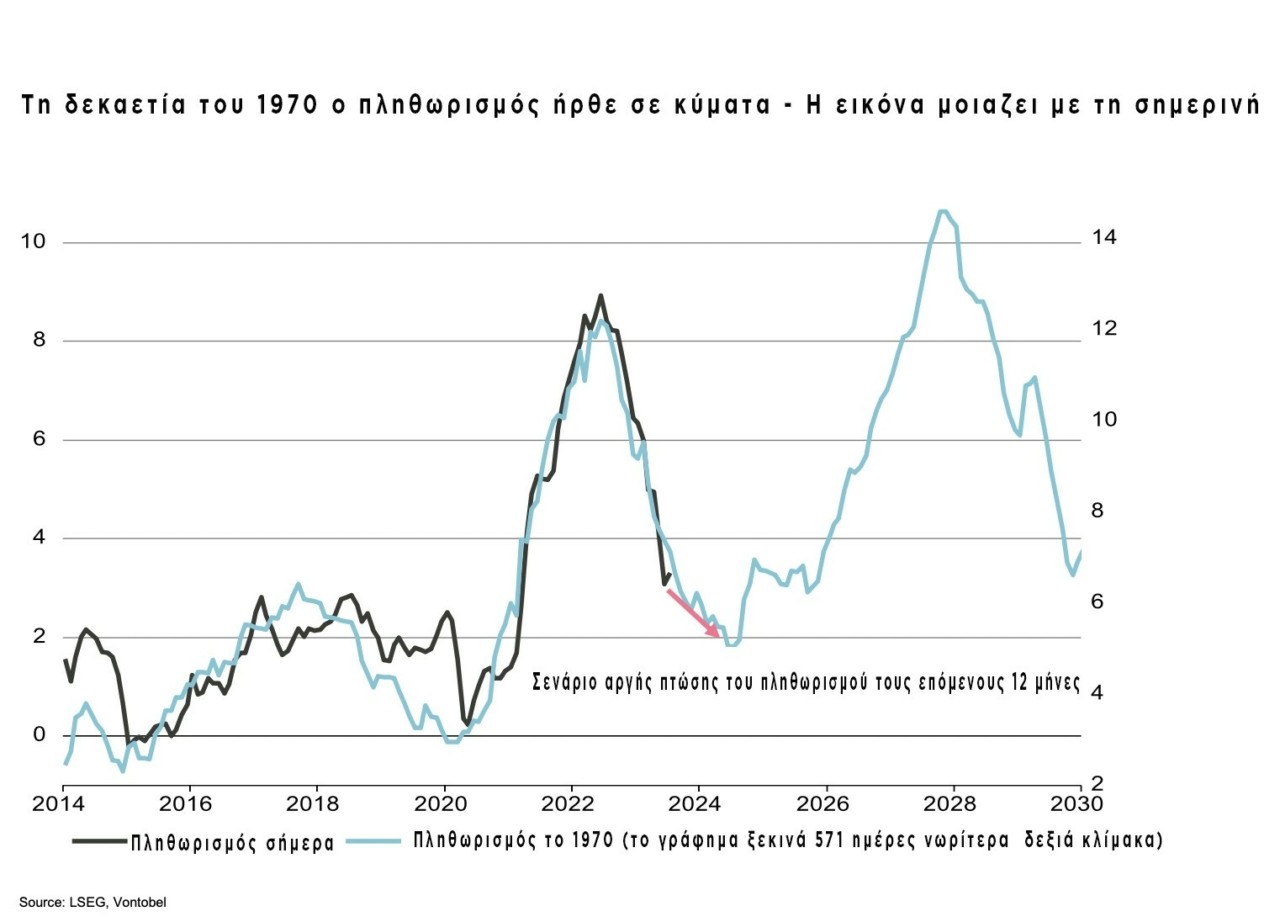 H διεθνής επενδυτική εταιρεία Vontobel, με έδρα την Ελβετία, στην τελευταία της έκθεση παρουσιάζει μια σειρά από πολύ ενδιαφέρουσες εκτιμήσεις και προβλέψεις, καθώς και μερικά εντυπωσιακά διαγράμματα, ένα από τα οποία απεικονίζει την εξέλιξη του πληθωρισμού σήμερα, σε σχέση με την πορεία που είχε το φαινόμενο τη δεκαετία του 1970.