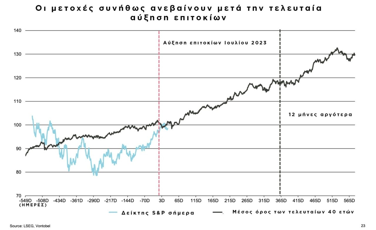 Το άλλο μοτίβο που έχει ενδιαφέρον είναι εκείνο που συσχετίζει την πορεία των μετοχών με το χρόνο της τελευταίας αύξησης των επιτοκίων που φαίνεται στο παρακάτω διάγραμμα, το οποίο δείχνει την πορεία του δείκτη μετοχών S&P 500 ύστερα από την τελευταία αύξηση επιτοκίων της FED. H γαλάζια γραμμή δείχνει την πορεία του δείκτη S&P500 σήμερα μέχρι τον Ιούλιο του 2023 (στην κόκκινη κάθετη διακεκομμένη γραμμή) , όταν η FED έκανε την τελευταία αύξηση επιτοκίων.