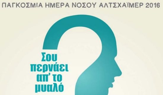 Στο πλαίσιο της Παγκόσμιας Ημέρας Νόσου Αλτσχάιμερ (21 Σεπτεμβρίου) η Εταιρεία Nόσου Alzheimer Αθηνών σε συνεργασία με το Aegean College, τη Μονάδα Φροντίδας Ηλικιωμένων ‘Ακτιος, το Κέντρο Ημέρας ΙΑΣΙΣ και το Κοινωνικό Ιατρείο ALZHEIMERS΄ Πειραιά- ΕΚΨΥΕ καθώς και τη συμβολή της Περιφέρειας Δυτικής Ελλάδας, διοργανώνει τις παρακάτω εκδηλώσεις: