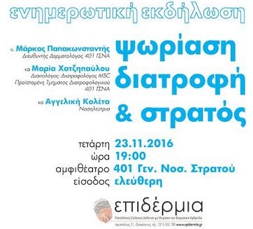 Ο Πανελλήνιος Σύλλογος Ασθενών με Ψωρίαση και Ψωριασική Αρθρίτιδα «Επιδέρμια» προσκαλεί σε ανοιχτή εκδήλωση κοινού με θέμα «Ψωρίαση, Διατροφή και Στρατός»