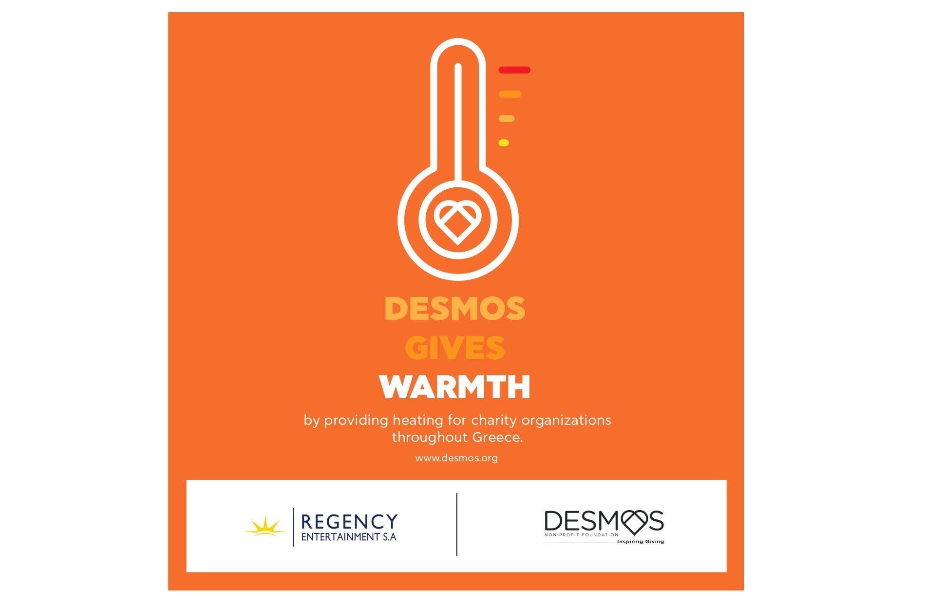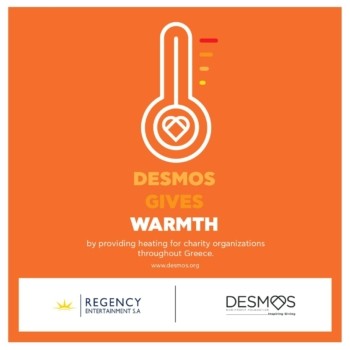 Φέτος, αντί εταιρικών δώρων, η Regency Entertainment – με συμμετοχή όλων των μονάδων της, Regency Casino Mont Parnes, Regency Casino Thessaloniki, Hyatt Regency Hotel Thessaloniki – συμμαχεί με τον μη κερδοσκοπικό Οργανισμό «ΔΕΣΜΟΣ» και υποστηρίζει τη δράση «Ο ΔΕΣΜΟΣ προσφέρει Ζεστασιά», με σκοπό να καλυφθούν τα κόστη θέρμανσης Ιδρυμάτων που φροντίζουν ευάλωτους συμπολίτες μας.