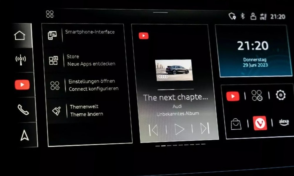 Για πρώτη φορά στην ιστορία της η Audi τοποθετεί σε επιλεγμένα μοντέλα της μια εφαρμογή βίντεο. Πρόκειται για το δημοφιλέστερο YouTube το οποίο οι κάτοχοι των μοντέλων A4, A5, Q5, A6, A7, Q8 e-tron και e-tron GT από το 2024 θα απολαμβάνουν μέσω του συστήματος infotainment MIB 3.