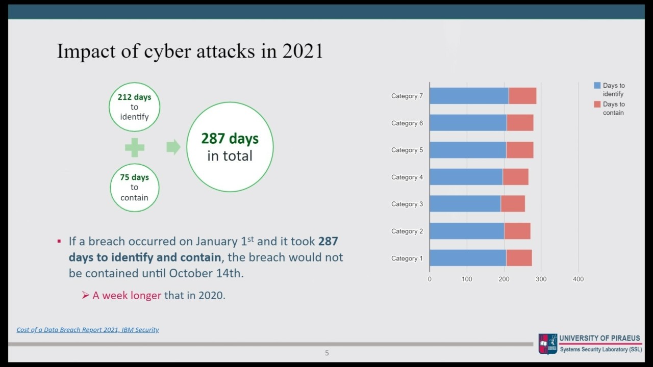 «Εάν μια κυβερνοεπίθεση συμβεί την πρώτη Ιανουαρίου, κατά μέσο όρο θα την καταλάβουμε στις 14 Οκτωβρίου. Χρειαζόμαστε περίπου 212 ημέρες κατά μέσο όρο για να εντοπίσουμε την κυβερνοεπίθεση και 75 ημέρες κατά μέσο όρο για να την αντιμετωπίσουμε. Αυτό σημαίνει πως όταν βλέπουμε μια κυβερνοεπίθεση, δεν σημαίνει ότι σημειώθηκε εκείνη τη στιγμή, η δράση των χάκερ έχει ξεκινήσει κατά μέσο όρο πριν δέκα μήνες» εξήγησε ο κ. Ξενάκης. «Κι όλα αυτά συμβαίνουν την ώρα που ο αριθμός των δεδομένων αυξάνεται κατακόρυφα. Το 2025 εκτιμάται πως θα έχουμε 200 zetabytes να προστατεύσουμε, ενώ θα έχουμε 338 δισεκατομμύρια γραμμές νέου κώδικα, χωρίς να υπολογίσουμε τον κώδικα που θα δημιουργηθεί από τα συστήματα ΑΙ».