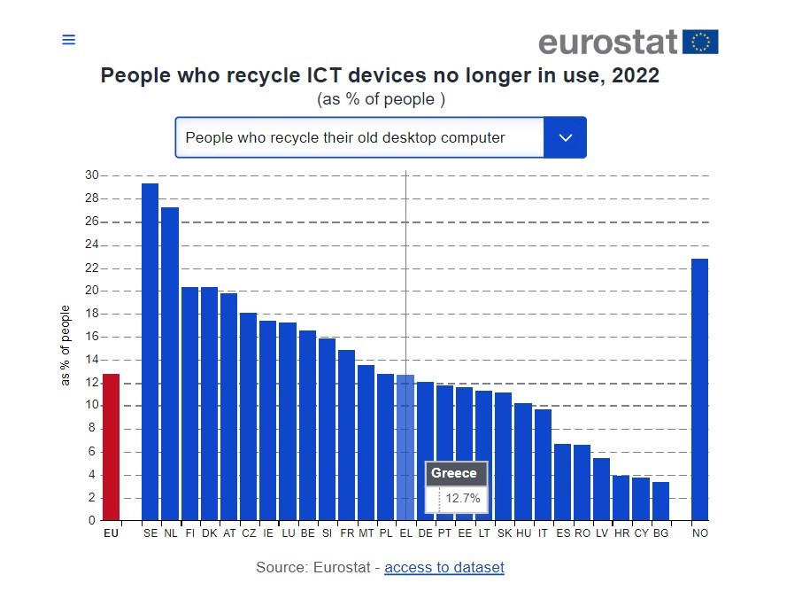 “Η αυξανόμενη χρήση εξοπλισμού ΤΠΕ έχει ως αποτέλεσμα την αυξανόμενη ποσότητα απορριμμάτων από παλιές συσκευές, όπως φορητούς υπολογιστές, tablet, κινητά τηλέφωνα, smartphone και επιτραπέζιους υπολογιστές. Αυτό εγείρει το ερώτημα τι συμβαίνει με τις συσκευές ΤΠΕ που δεν απαιτούνται πλέον”, σχολιάζει η Eurostat.