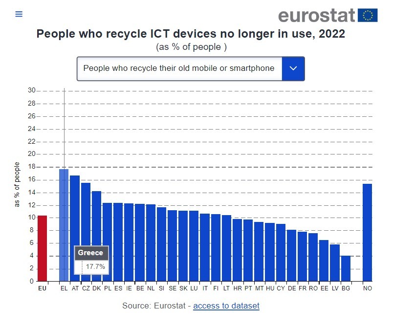 Σύμφωνα με τα στοιχεία, που έδωσε στη δημοσιότητα η Eurostat, η Ελλάδα (18%), η Αυστρία (17%) και η Τσεχία (15%) ανέφεραν τα υψηλότερα ποσοστά ανακύκλωσης των παλιών smartphones. H Δανία (14%) και η Πολωνία, η Ισπανία, η Ιρλανδία, το Βέλγιο και η Ολλανδία ακολουθούν, όλες με ποσοστά κοντά στο 12%.