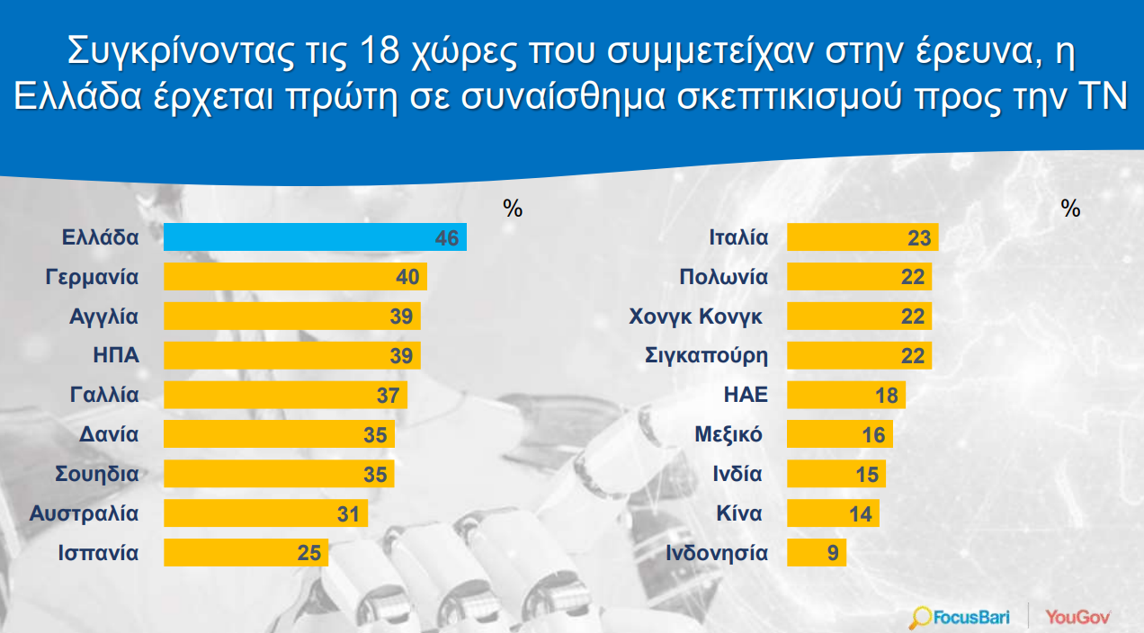 Το κυρίαρχο συναίσθημα του κόσμου απέναντι στην Τεχνητή Νοημοσύνη στην Ελλάδα, αλλά και σε όλες τις χώρες είναι ο σκεπτικισμός, σύμφωνα με τη νέα έρευνα που πραγματοποιήθηκε στην Ελλάδα από την Focus Bari | YouGov και σε άλλες 17 χώρες μέσω του δικτύου YouGov.