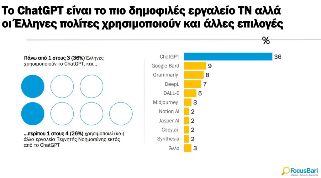Το ChatGPT είναι το πιο δημοφιλές εργαλείο τεχνητής νοημοσύνης (πάνω από 1 στους 3 Έλληνες το χρησιμοποιούν) αλλά οι Έλληνες πολίτες χρησιμοποιούν και άλλες επιλογές, όπως αποκαλύπτει η Focus Bari.
