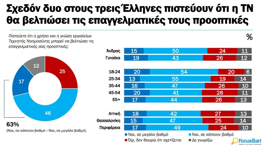 Η τεχνητή νοημοσύνη ανοίγει νέους επαγγελματικούς ορίζοντες για τους περισσότερους Έλληνες, ειδικά για τους χρήστες της, δίνοντας ώθηση σε δεξιότητες και ευκαιρίες. Σχεδόν δύο στους τρεις Έλληνες πιστεύουν ότι η τεχνητή νοημοσύνη θα βελτιώσει τις επαγγελματικές τους προπτικές.