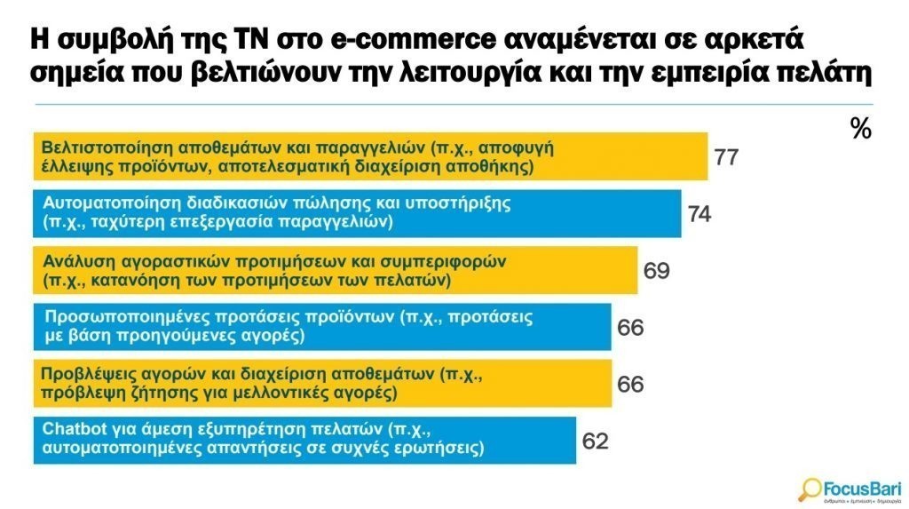Στον τομέα του e-commerce, η ΤΝ προβλέπεται να ενισχύσει τη λειτουργία των καταστημάτων και να βελτιώσει την εμπειρία του πελάτη, σύμφωνα με τις προσδοκίες των Ελλήνων. Εννιά στους δέκα Έλληνες (ποσοστό 89%) περιμένουν ότι η χρήση τεχνητής νοημοσύνης θα βοηθήσει αρκετούς κλάδους.