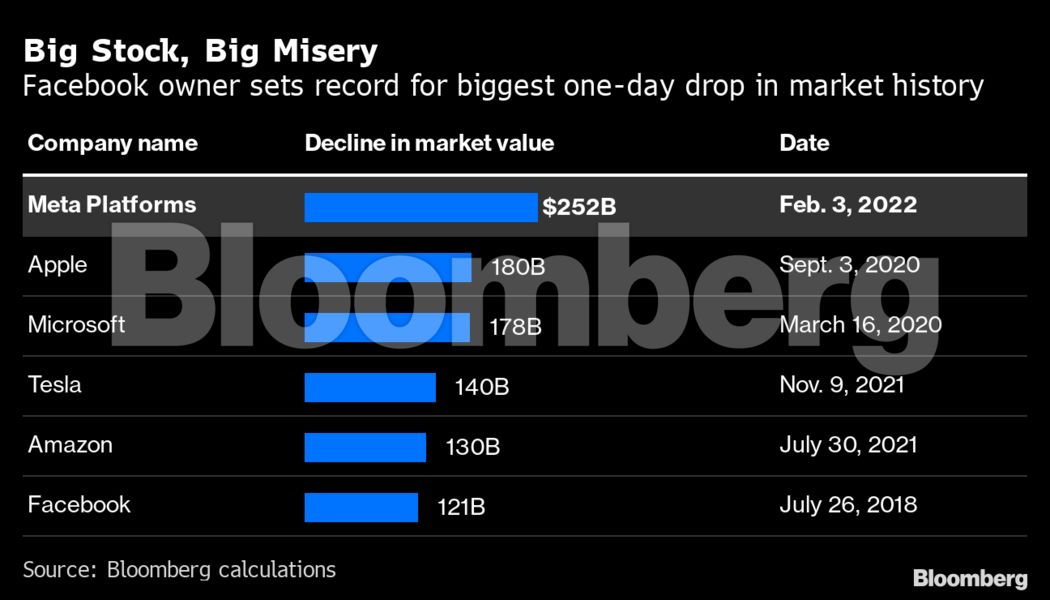 Δεν είναι η πρώτη φορά που οι μετοχές της Meta πέφτουν δραματικά. Η μετοχή σημείωσε βουτιά 19% τον Ιούλιο του 2018 λόγω της επιβράδυνσης της αύξησης των χρηστών, που μεταφράζεται σε πτώση περίπου 120 δισεκατομμυρίων δολαρίων στην κεφαλαιοποίηση της αγοράς.