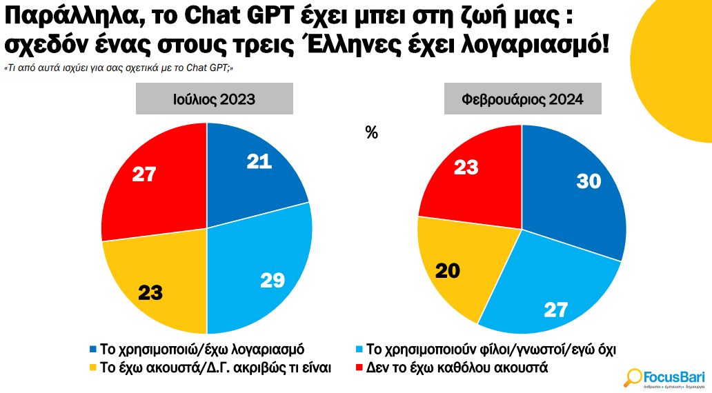 - Η αναλογία των Ελλήνων που έχουν λογαριασμό Chat GPT συνεχώς αυξάνεται, από 21% τον Ιούλιο 2023 σε 30% τον Φεβρουάριο 2024, και χρησιμοποιείται για πλειάδα θεμάτων ενδιαφέροντος, για την εργασία και για τις σπουδές από τους φοιτητές.