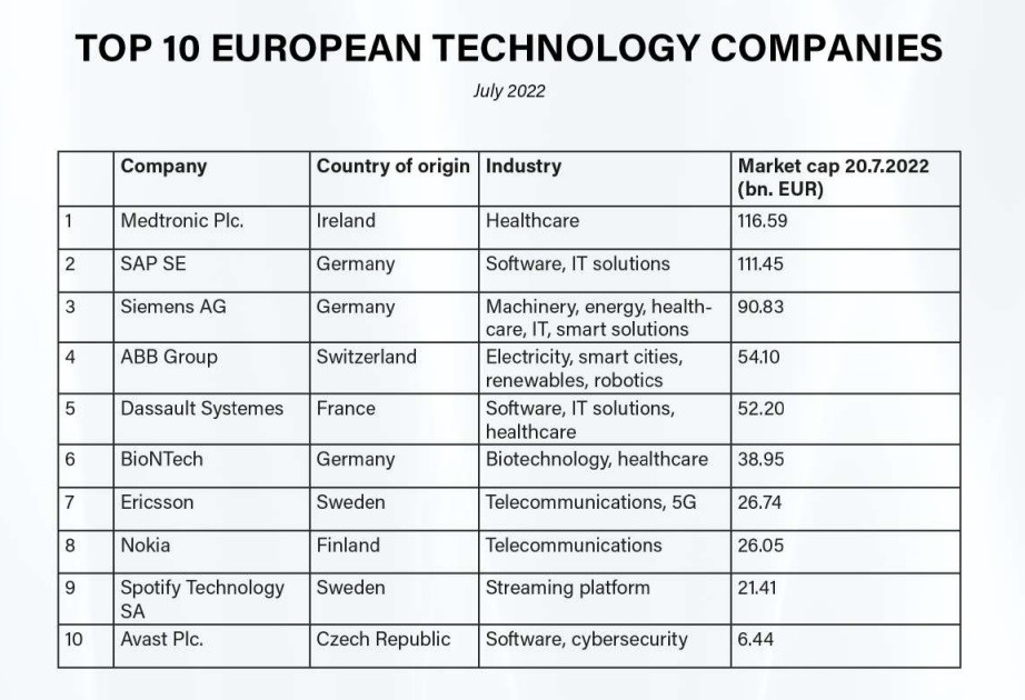 Η εταιρεία που μέχρι πρότινος βρισκόταν στην κορυφή, ο γερμανικός κολοσσός λογισμικού SAP, «εκτοπίστηκε» από μια τεχνολογική εταιρεία που εστιάζει στην υγειονομική περίθαλψη, τη Medtronic. Αντίστοιχα, η ελβετο-σουηδική ΑΒΒ βελτίωσε τη θέση της και πλέον κατατάσσεται 4η, αποφεύγοντας τη βαθιά πτώση της κεφαλαιοποίησης της αγοράς, όπως δείχνει το σχετικό γράφημα που ενημερώθηκε μετά το πρώτο εξάμηνο του 2022.