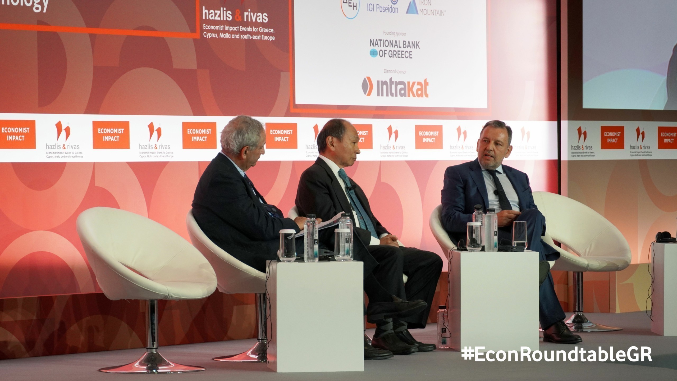 Λεζάντα φωτογραφίας: Από αριστερά προς δεξιά: Daniel Franklin, Executive Editor and Senior Editor, United States, The Economist, Francis Fukuyama, Senior Fellow, Centre on Democracy, Development and the Rule of Law στο Stanford University, Haris Broumidis Chairman & CEO at Vodafone Greece