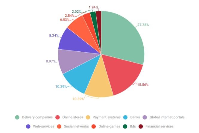 Σύμφωνα με την τελευταία έκθεση της Kaspersky για το spam και το phishing το 2022, οι ιστοσελίδες που παριστάνουν υπηρεσίες delivery είχαν το υψηλότερο ποσοστό κλικ σε συνδέσμους phishing (27,38%) που εμποδίστηκαν από λύσεις της Κaspersky. Τα ηλεκτρονικά καταστήματα (15,56%) κατέλαβαν τη δεύτερη θέση. Τα συστήματα πληρωμών (10,39%) και οι τράπεζες (10,39%) κατέλαβαν την τρίτη και τέταρτη θέση, αντίστοιχα.