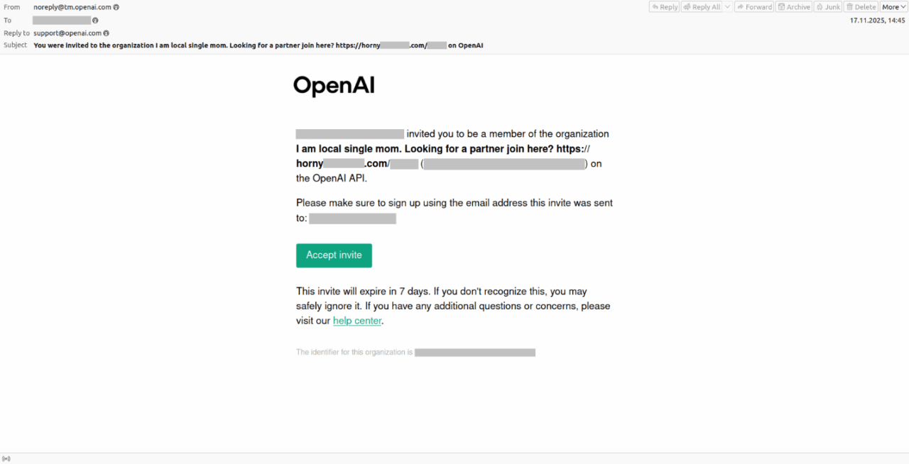 Η Kaspersky εντόπισε μια τακτική εξαπάτησης που εκμεταλλεύεται την πλατφόρμα της OpenAI. Οι επιτιθέμενοι κάνουν κατάχρηση των λειτουργιών δημιουργίας οργανισμών και πρόσκλησης μελών ομάδας, προκειμένου να αποστέλλουν ανεπιθύμητα email (spam) από νόμιμες διευθύνσεις της OpenAI. Στόχος τους είναι να εξαπατήσουν τους χρήστες ώστε να κάνουν κλικ σε κακόβουλους συνδέσμους ή να καλέσουν παραπλανητικούς τηλεφωνικούς αριθμούς.