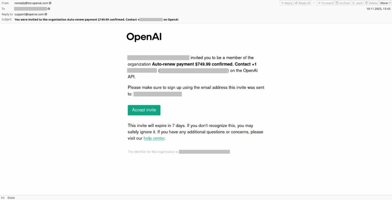 Όταν αποστέλλονται οι προσκλήσεις, προέρχονται από επίσημη διεύθυνση της OpenAI, γεγονός που τις κάνει να φαίνονται απολύτως έγκυρες από τεχνικής άποψης. Η Kaspersky εντόπισε διάφορους τύπους μηνυμάτων που περιείχαν απειλές μέσω email και αποστέλλονταν με αυτόν τον τρόπο. Πρόκειται για email εξαπάτησης που προωθούν κακόβουλες προσφορές, όπως υπηρεσίες ενηλίκων. Μια ακόμη παράμετρος της επίθεσης είναι το vishing (τηλεφωνική απάτη) – πρόκειται για ψευδείς ειδοποιήσεις που ισχυρίζονται ότι κάποια συνδρομή έχει ανανεωθεί για μεγάλο χρηματικό ποσό. Οι επιτιθέμενοι δίνουν οδηγία στους παραλήπτες να καλέσουν έναν τηλεφωνικό αριθμό που τους δίνεται για να «ακυρώσουν» τη χρέωση ή να προβούν σε άλλες ενέργειες που οδηγούν σε περαιτέρω παραβίαση. Είναι πιθανό να υπάρχουν και άλλες απειλές μέσω email που διαδίδονται μέσω της πλατφόρμας της OpenAI.