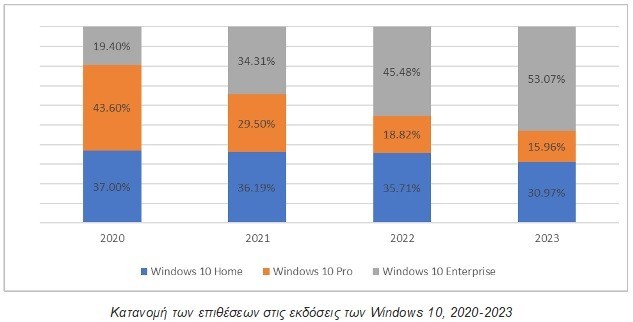Το 2023, οι ειδικοί της Κaspersky κατέληξαν στο συμπέρασμα ότι πάνω από τις μισές συσκευές (53%) που μολύνθηκαν με κακόβουλο λογισμικό κλοπής διαπιστευτηρίων ήταν εταιρικές. Παράλληλα, με βάση τα ευρήματα, το μεγαλύτερο μερίδιο μολύνσεων από infostealer βρέθηκε στην έκδοση Windows 10 Enterprise. Το παρακάτω διάγραμμα απεικονίζει την κατανομή των επιθέσεων μεταξύ των διαφόρων εκδόσεων των Windows 10, που εκτείνεται από το 2020 έως το 2023.