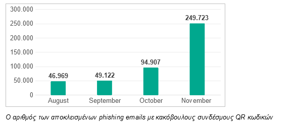 Aπότομη αύξηση στα phishing emails που περιείχαν κακόβουλους κωδικούς QR εντόπισαν oι ειδικοί της Kaspersky. Οι ανιχνεύσεις αυτών των επιθέσεων αυξήθηκαν από 46.969 τον Αύγουστο σε 249.723 τον Νοέμβριο — δηλαδή περισσότερο από πενταπλάσια αύξηση — καθώς οι κυβερνοεγκληματίες εκμεταλλεύονται ολοένα και περισσότερο τους κωδικούς QR. Οι δράστες χρησιμοποιούν συχνότερα κωδικούς QR σε emails, επειδή αποτελούν έναν απλό και οικονομικά αποδοτικό τρόπο απόκρυψης κακόβουλων URLs, παρακάμπτοντας τον εντοπισμό από πολλές λύσεις προστασίας.