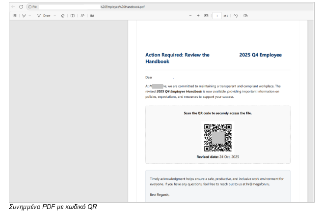 Τέτοιοι κωδικοί QR ενσωματώνονται απευθείας στο σώμα των emails ή, ακόμη πιο συχνά, μέσα σε συνημμένα αρχεία PDF – μια εξέλιξη που αφενός αποκρύπτει τους phishing συνδέσμους και αφετέρου ενθαρρύνει τους χρήστες να σαρώνουν τα αρχεία από κινητά τηλέφωνα, τα οποία ενδέχεται να διαθέτουν ασθενέστερα μέτρα ασφαλείας σε σύγκριση με τους εταιρικούς υπολογιστές.