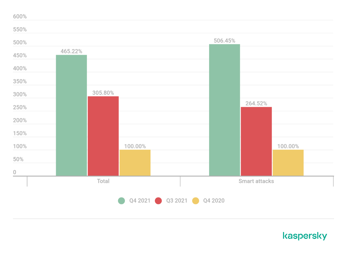 Από τον Οκτώβριο έως τα τέλη Δεκεμβρίου του 2021, οι ερευνητές της Kaspersky παρατήρησαν μια αξιοσημείωτη αύξηση στον αριθμό των επιθέσεων DDoS – αριθμός ρεκόρ σε ολόκληρη την ιστορία των παρατηρήσεων του συγκεκριμένου τύπου απειλής από την Kaspersky.
