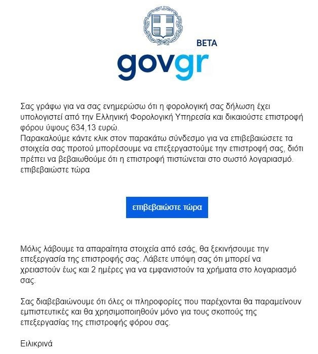 Στο ίδιο μήνυμα ζητείται από τον παραλήπτη να επικαιροποιήσει τα στοιχεία του τραπεζικού του λογαριασμού, ώστε να γίνει η πίστωση του ποσού που δικαιούται.