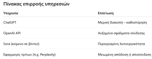 Η πρώτη μεγάλη κορύφωση των αναφορών καταγράφηκε στις 14:45 ώρα Ελλάδας, σύμφωνα με τον ιστότοπο Down Detector, με επόμενη αιχμή λίγο αργότερα. Το πρόβλημα επηρέασε και το Sora —την πλατφόρμα της OpenAI για τη μετατροπή κειμένου σε βίντεο— αλλά και εφαρμογές τρίτων που στηρίζονται σε API της εταιρείας, όπως η αναδυόμενη μηχανή αναζήτησης Perplexity.