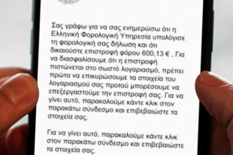 Το fake μήνυμα αναφέρει: «Σας γράφω για να σας ενημερώσω ότι η Ελληνική Φορολογική Υπηρεσία υπολόγισε τη φορολογική σας δήλωση και δικαιούστε επιστροφή φόρου ύψους 600,13 ευρώ. Για να διασφαλίσουμε ότι η επιστροφή πιστώνεται στο σωστό λογαριασμό, πρέπει πρώτα να επικυρώσουμε τα στοιχεία του λογαριασμού σας προτού μπορέσουμε να επεξεργαστούμε την επιστροφή σας. Για να γίνει αυτό, παρακαλούμε κάντε κλικ στον παρακάτω σύνδεσμο και επιβεβαιώστε τα στοιχεία σας».