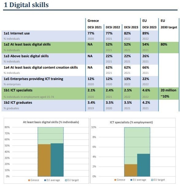 Σήμερα, σύμφωνα με την αξιολόγηση της Επιτροπής, πάνω από το ήμισυ του ελληνικού πληθυσμού (ηλικίας 16-74 ετών) έχει τουλάχιστον βασικές ψηφιακές δεξιότητες (52%), κοντά στον μέσο όρο της Ε.Ε. (54%), αλλά κάτω από τον στόχο της Ψηφιακής δεκαετίας της Ε.Ε. του 80% έως το 2030. Ωστόσο, το ποσοστό των ειδικών ΤΠΕ στη συνολική απασχόληση στην Ελλάδα βρίσκεται στο 2,5%, κάτω από τον μέσο όρο της Ε.Ε. που είναι 4,6%, και από τα χαμηλότερα στην Ε.Ε.