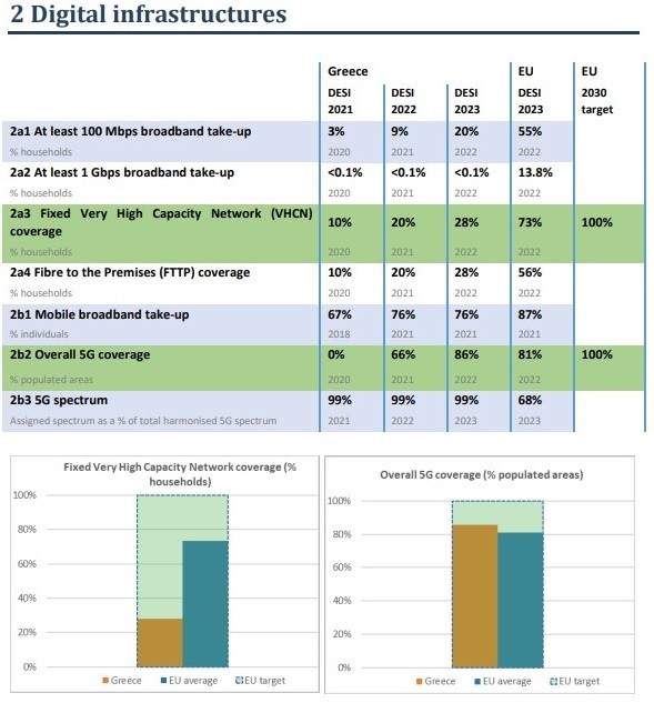 Όπως αναφέρει η έκθεση, στη συνδεσιμότητα, η Ελλάδα συνεχίζει να έχει χαμηλή βαθμολογία στους περισσότερους δείκτες σταθερής ευρυζωνικής σύνδεσης: η χρήση συνδέσεων 100 Mbps είναι στο 20%, και το 1 Gbps στο 0% (παρ’ όλο που το 1 Gbps είναι διαθέσιμο στο 28% των νοικοκυριών). Αυτό – σύμφωνα με την Επιτροπή – είναι χαμηλότερο από τον μέσο όρο της Ε.Ε. για την κάλυψη VHCN και FTTP (28% και για τα δύο).