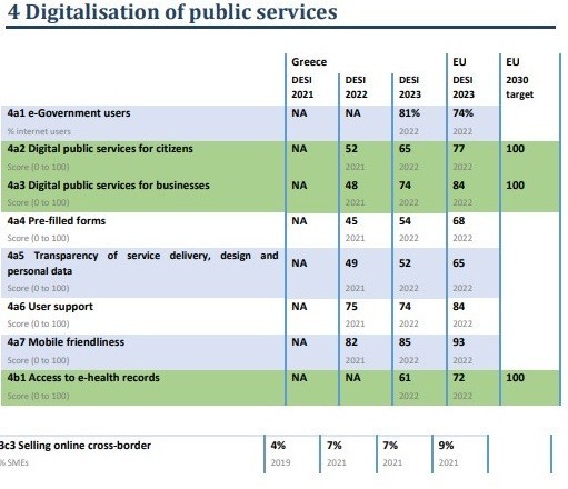 Ωστόσο, σύμφωνα πάντα με την Ευρωπαϊκή Επιτροπή, η Ελλάδα εξακολουθεί να σημειώνει βαθμολογία κάτω από τον μέσο όρο της Ε.Ε. για τους δύο δείκτες, που μετρούν τις ψηφιακές δημόσιες υπηρεσίες για ανθρώπους και επιχειρήσεις. Πάντως, η Επιτροπή σχολιάζει ότι τα αποτελέσματα δείχνουν αξιοσημείωτη πρόοδο στις Ψηφιακές δημόσιες υπηρεσίες για πολίτες, όπου η Ελλάδα βαθμολογείται με 65 (αύξηση 13 μονάδων από το προηγούμενο έτος), ενώ στις ψηφιακές υπηρεσίες προς επιχειρήσεις, η βαθμολογία είναι 74 (αύξηση 26 μονάδων από το προηγούμενο έτος).