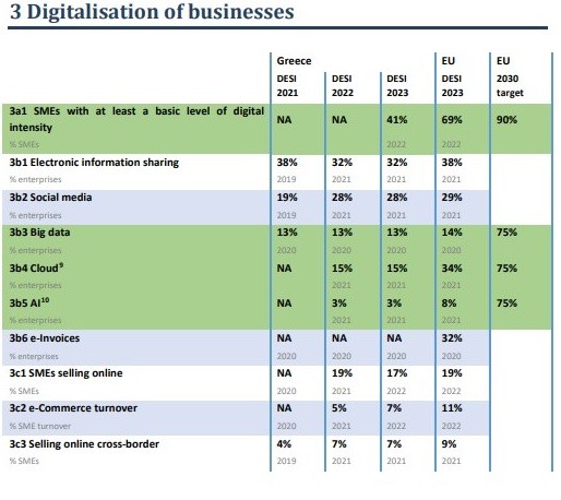 Από τα ίδια στοιχεία προκύπτει ότι το επίπεδο ψηφιακής έντασης των ΜμΕ στην Ελλάδα είναι 41% και απέχει πολύ από τον μέσο όρο της Ε.Ε., που είναι 69%. Όσον αφορά την υιοθέτηση προηγμένων ψηφιακών τεχνολογιών, οι επιχειρήσεις ήταν πιο αργές στην υιοθέτησή τους: το 2020, το 13% χρησιμοποιούσε ανάλυση μεγάλων δεδομένων (μέσος όρος Ε.Ε.: 14%), ενώ το 15% χρησιμοποιούσε υπηρεσίες cloud το 2021 (μέσος όρος Ε.Ε.: 34%) και μόνο το 3% χρησιμοποιούσε τεχνητή νοημοσύνη (μέσος όρος Ε.Ε.: 8%).