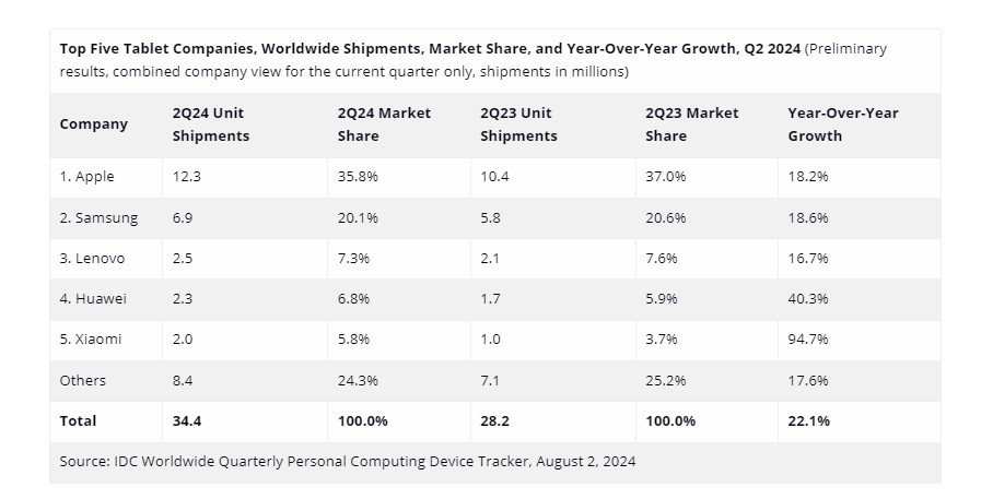 Σε επίπεδο κατασκευαστών, η Apple πέτυχε πωλήσεις 12,3 εκατ. μονάδων, αυξημένες κατά 18,2% σε ετήσια βάση το 2ο τρίμηνο του έτους. “Με την κυκλοφορία των μοντέλων iPad Air και iPad Pro 11″ και 13″, η εταιρεία κατάφερε επιτέλους να σημειώσει ανάπτυξη στην αγορά. Ο όγκος των iPad αυξήθηκε σε ολόκληρο τον κόσμο, εκτός από την Κίνα, όπου ο ανταγωνισμός από τοπικούς παίκτες, όπως η Huawei και η Xiaomi, επηρέασε αρνητικά την εταιρεία”, αναφέρει η ανάλυση της IDC.