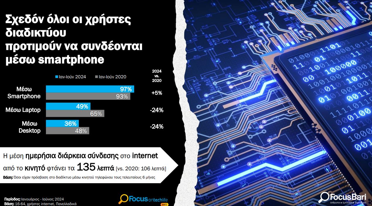 Αυτό προκύπτει από τη νέα έκδοση της Focus on Tech Life της Focus Bari, η οποία καταγράφει μεταξύ άλλων και σημαντική άνοδο στη χρήση του διαδικτύου από άτομα ηλικίας 65-74 στην Ελλάδα.