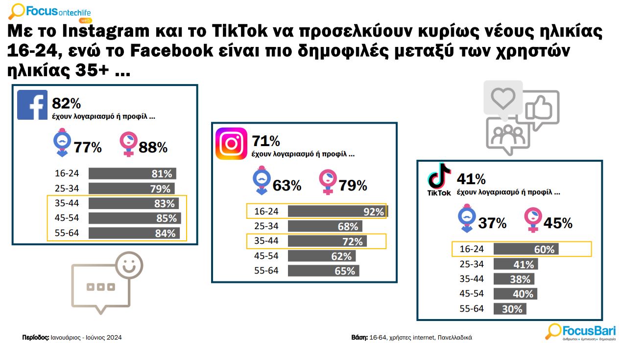 Σε ό,τι αφορά τη χρήση των social media από διαφορετικές γενιές, TikTok και Instagram παρουσιάζουν απόλυτη κυριαρχία στους νέους ηλικίας 16-24, ενώ το Facebook παραμένει πιο δημοφιλές στις ηλικίες 35+.