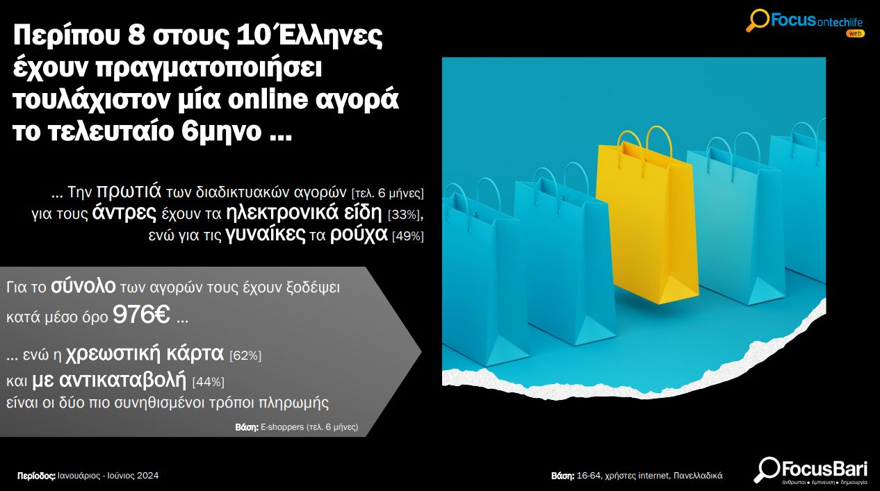 Δύο στους τρεις πολίτες έχουν κάνει online αγορές το τελευταίο εξάμηνο, ξοδεύοντας κατά μέσο όρο 976 ευρώ.
