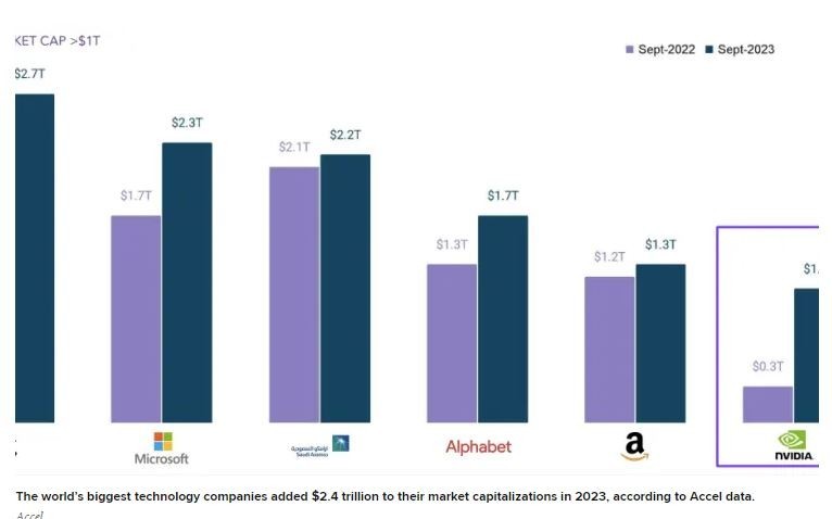 Περίπου 2,4 τρισεκατομμύρια δολάρια πρόσθεσαν οι αμερικανικοί τεχνολογικοί γίγαντες στις κεφαλαιοποιήσεις αγοράς σε ένα έτος που ορίζεται από τη διαφημιστική εκστρατεία γύρω από την παραγωγική τεχνητή νοημοσύνη, σύμφωνα με μια νέα έκθεση της εταιρείας επιχειρηματικών κεφαλαίων Accel.