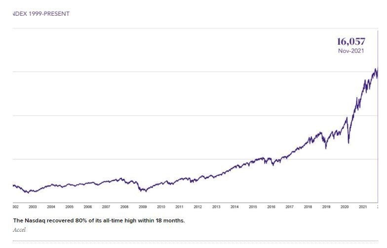 Ο τεχνολογικός δείκτης της Wall Street, Nasdaq Composite επέστρεψε στο 80% του ιστορικού του υψηλού μέσα σε 18 μήνες, σύμφωνα με την Accel, σημειώνοντας ταχύτερη ανάκαμψη από ό,τι μετά την κατάρρευση του dotcom τη δεκαετία του 1990.