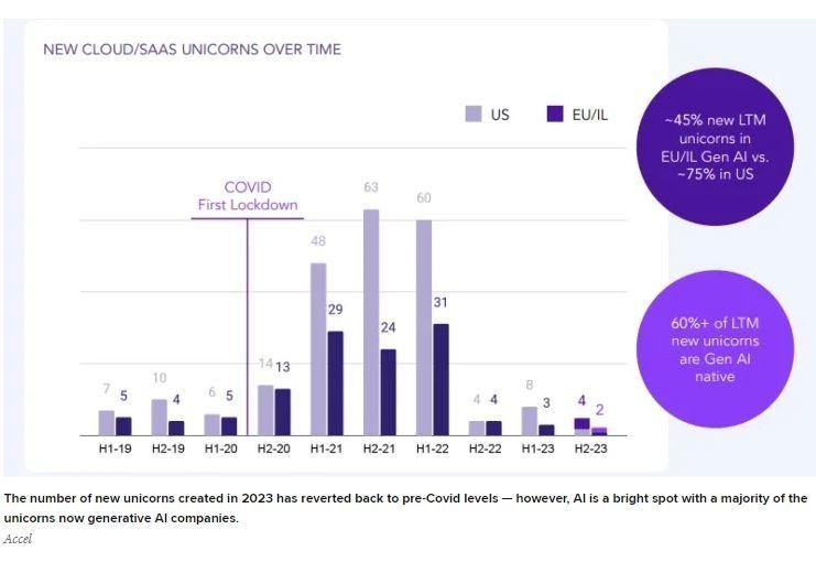 Ο αριθμός των εταιρειών unicorn επανήλθε στα προ-Covid επίπεδα, με την τεχνητή νοημοσύνη να καταλαμβάνει πολύ μεγαλύτερο ποσοστό νέων εταιρειών δισεκατομμυρίων δολαρίων. Στην Ευρώπη και το Ισραήλ, το 40% των νέων μονόκερων ήταν στον κλάδο της παραγωγικής τεχνητής νοημοσύνης, ενώ στις Ηνωμένες Πολιτείες ήταν το 80%.