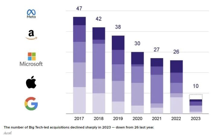 Υπήρχαν μόνο 10 συναλλαγές που αφορούσαν μια εταιρεία Big Tech φέτος, σημείωσε η Accel. Πρόκειται για μια απότομη μείωση σε σχέση με τα προηγούμενα χρόνια. Το 2021, οι εξαγορές με επικεφαλής την FAANG (Facebook, Amazon, Apple, Netflix και Google) έφτασαν τις 27 και το 2022 υπήρξαν 26 συμφωνίες στον κλάδο των Big Tech.