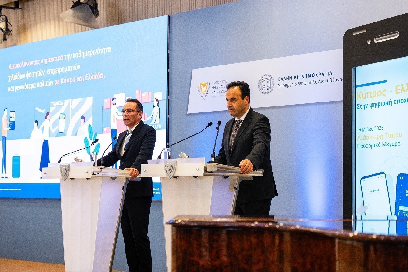 Σε λειτουργία τίθεται από σήμερα η διαλειτουργικότητα μεταξύ των ψηφιακών πορτοφολιών Ελλάδας και Κύπρου «Gov.gr Wallet» και «Ψηφιακός Πολίτης». Με τον τρόπο αυτό διευκολύνεται ουσιαστικά η καθημερινότητα για πολίτες και επιχειρηματίες, που ζουν και δραστηριοποιούνται στις δύο χώρες. Την παρουσίαση πραγματοποίησαν σήμερα (19.05.2025) στο Προεδρικό Μέγαρο στη Λευκωσία ο Υφυπουργός Έρευνας, Καινοτομίας και Ψηφιακής Πολιτικής της Κυπριακής Δημοκρατίας, Δρ. Νικόδημος Δαμιανού και ο Υπουργός Ψηφιακής Διακυβέρνησης, Δημήτρης Παπαστεργίου.