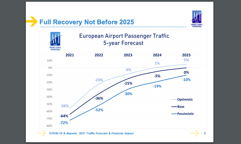 Η ACI Europe αναθεώρησε προς το χειρότερο την πρόβλεψη για την επιβατική κίνηση στα αεροδρόμια της Ευρώπης, η οποία με βάση την εκτίμησητου Απριλίου, αναμένεται να μειωθεί κατά 64% το 2021, ενώ η αντίστοιχη εκτίμηση τον περασμένο Ιανουάριο ήταν για μείωση 52% τον Ιανουάριο. Η πλήρης ανάκαμψη της επιβατικής κίνησης στα ευρωπαϊκά αεροδρόμια πίσω στα νούμερα του 2019 εκτιμάται πλέον για το 2025 έναντι του 2024 που ήταν η πρώτη πρόβλεψη, ενώ στο αισιόδοξο σενάριο μπορεί να υπάρξει αύξηση 5%.
