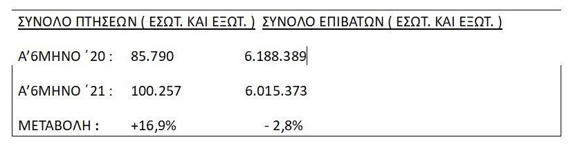 Τα συνολικά στατιστικά στοιχεία πρώτου εξαμήνου 2021, από όλα τα αεροδρόμια της χώρας μας, συνεχίζουν όμως να αποτυπώνουν τις αρνητικές επιπτώσεις που έχει επιφέρει στις αερομεταφορές η πανδημία της νόσου Covid-19 από τον Μάρτιο του 2020 όπου τέθηκαν σε ισχύ οι πρώτες απαγορεύσεις/περιορισμοί πτήσεων, καταγράφοντας μια μικρή πτώση (-) 2,8% σε σχέση με την περσινή αντίστοιχη σεζόν, ενώ σε σχέση με το πρώτο εξάμηνο του 2019 η πτώση φτάνει το (-) 72,7%.