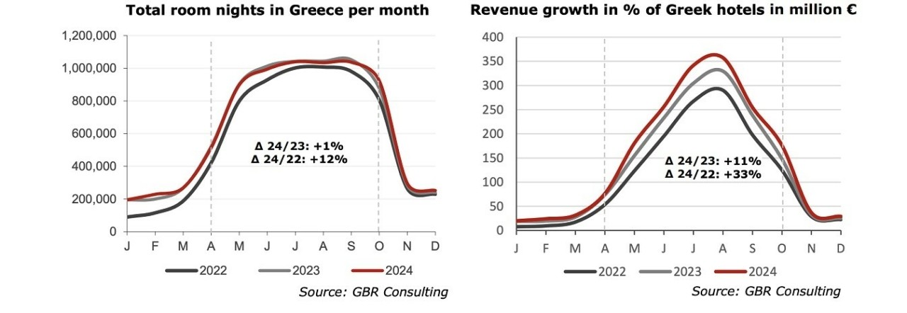 Οσον αφορά τα έσοδα των ξενοδοχείων, με βάση τις έρευνες που πραγματοποιεί η εταιρεία σε ένα πολύ μεγάλο δείγμα ξενοδοχείων, με τζίρο 1,8 δισ. ευρώ και κοντά 8 εκατομμύρια διανυκτερεύσεις (είτε αφορά αστικά ξενοδοχεία είτε ακόμη και resorts) οι διανυκτερεύσεις αυξήθηκαν πέρσι σε πολύ μικρό ποσοστό κάτω του 1% και συγκεκριμένα κατά 0,6% σε σύγκριση με το 2023. Aπό την άλλη πλευρά, σε διψήφιο ποσοστό ανήλθε η αύξηση των εσόδων με ένα + 11,1%, γεγονός, το οποίο αποδίδεται κατά κύριο λόγο στην αύξηση των τιμών ανά διανυκτέρευση. Επισημαίνεται εδώ ότι το δείγμα στο οποίο έχει στηριχθεί η ανάλυση της GBR είναι αρκούντως αντιπροσωπευτικό και αντιστοιχούν σχεδόν στο 1/5 επί του συνόλου αν ληφθεί υπόψη ότι τα έσοδα των ελληνικών ξενοδοχείων με βάση τα τελευταία διαθέσιμα στοιχεία του 2023 εκτιμήθηκαν στα 10,6 δισ. ευρώ.