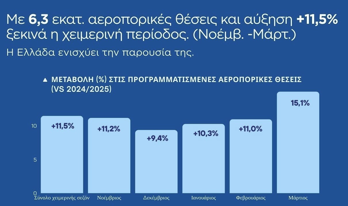 Με 6,3 εκατομμύρια αεροπορικές θέσεις διαθέσιμες σε εισερχόμενες πτήσεις από το εξωτερικό στα αεροδρόμια ανά την Ελλάδα για τους μήνες από τον Νοέμβριο έως και τον Μάρτιο του 2026, η χώρα μας ενισχύει τη θέση της κατά τη διάρκεια της παραδοσιακά πιο χαμηλής, χειμερινής περιόδου.