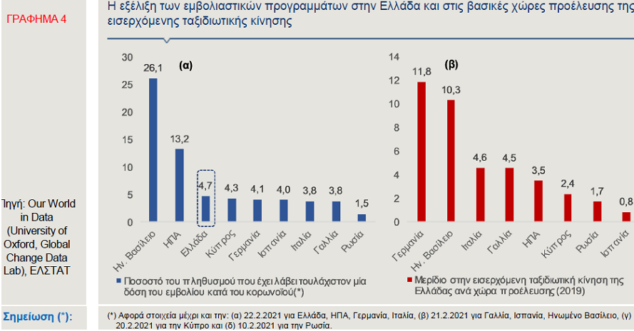 Η ταχεία ολοκλήρωση και αποτελεσματικότητα των εμβολιαστικών προγραμμάτων τόσο στη χώρα μας, όσο και στις χώρες, οι οποίες -παραδοσιακά- καταλαμβάνουν σημαντικό μερίδιο της εισερχόμενης ταξιδιωτικής κίνησης στην Ελλάδα, θα είναι κρίσιμης σημασίας για την αύξηση της τουριστικής ζήτησης, επιτρέποντας μεγαλύτερη χαλάρωση των περιορισμών και βελτίωση της καταναλωτικής εμπιστοσύνης.