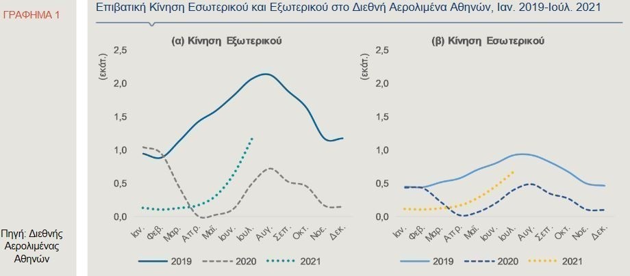 Επιπρόσθετα, η επιβατική κίνηση στο Διεθνή Αερολιμένα Αθηνών τον Ιούνιο και τον Ιούλιο του τρέχοντος έτους σημείωσε ετήσια άνοδο ύψους 247% και 107%, αντίστοιχα. Εξακολουθούσε, ωστόσο, να υπολείπεται σε σύγκριση με την επιβατική κίνηση του Ιουνίου (42%) και του Ιουλίου (62%) του 2019.