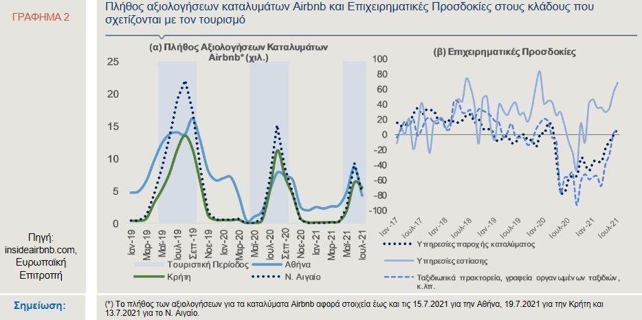 Παράλληλα, θετικά κρίνεται το γεγονός ότι τα στοιχεία για τη δραστηριότητα της βραχυχρόνιας μίσθωσης ακινήτων, μέσω της ψηφιακής πλατφόρμας Airbnbi και συγκεκριμένα το πλήθος των αξιολογήσεων από τους επισκέπτες για τα εγγεγραμμένα καταλύματα κινείται έντονα ανοδικά, ήδη από τον Απρίλιο. Τέλος, οι επιχειρηματικές προσδοκίες στους κλάδους που σχετίζονται με τον τουρισμό (καταλύματα, εστίαση, ταξιδιωτικά πρακτορεία, κ.λπ.) έχουν επανέλθει σε θετικό έδαφος και μάλιστα στα επίπεδα που είχαν καταγράψει πριν από την πανδημική κρίση.