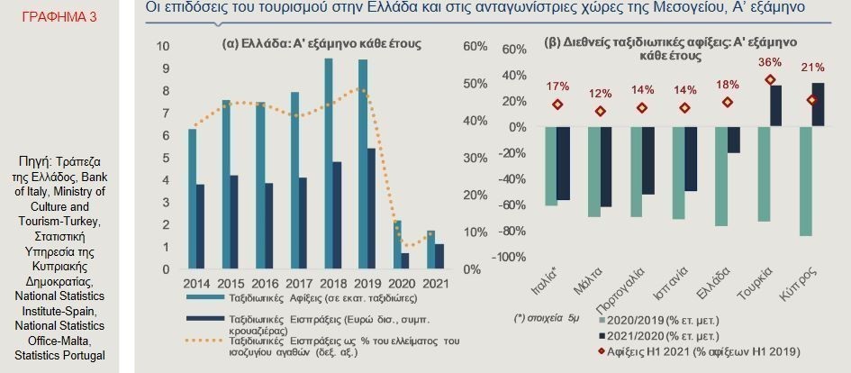 Όπως παρατηρείται στο Γράφημα 3β, οι ταξιδιωτικές αφίξεις μειώθηκαν το πρώτο εξάμηνο του 2021 στις περισσότερες ανταγωνίστριες χώρες της Ελλάδας στη Μεσόγειο, με εξαίρεση την Τουρκία και την Κύπρο όπου καταγράφηκε άνοδος. Οι δύο αυτές χώρες και η Ελλάδα, είχαν υποστεί τις μεγαλύτερες απώλειες σε όρους αφίξεων το πρώτο εξάμηνο του 2020, σε σύγκριση με τις υπόλοιπες χώρες που περιλαμβάνονται στο γράφημα. Αξίζει επιπλέον να σημειωθεί, ότι η πτώση των διεθνών τουριστικών αφίξεων στη χώρα μας ήταν σημαντικά πιο περιορισμένη σε σύγκριση με την Ιταλία (στοιχεία πενταμήνου), την Ισπανία, την Πορτογαλία και τη Μάλτα, όπου οι ετήσιες μειώσεις κινήθηκαν από 50%, έως και 62%. Ως ποσοστό των ταξιδιωτικών αφίξεων του πρώτου εξαμήνου του 2019, οι διεθνείς τουριστικές αφίξεις φέτος στην Τουρκία ανήλθαν σε 36%, στην Κύπρο σε 21%, στη χώρα μας σε 18%, ενώ στις υπόλοιπες χώρες κινήθηκαν σε χαμηλότερα ποσοστά. Τέλος, οι διεθνείς αφίξεις στη χώρα μας από ταξιδιώτες με προέλευση της Ευρωπαϊκή Ένωση ανέκαμψαν σημαντικά το πρώτο τρίμηνο του 2021 (+153%, σε ετήσια βάση), ενώ οι η εισερχόμενη τουριστική κίνηση από χώρες εκτός ΕΕ-27 μειώθηκε σε σύγκριση με το ίδιο διάστημα του 2020, κατά 24%.
