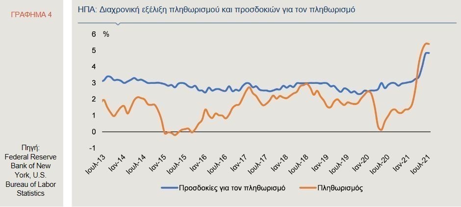 Ο πληθωρισμός ενδεχομένως να υποχωρήσει αργότερα μέσα στο έτος, καθώς αντικατοπτρίζει εφάπαξ αυξήσεις οι οποίες προκλήθηκαν σε μεγάλο βαθμό από τις διαταραχές στην αλυσίδα εφοδιασμού και τα υψηλότερα μεταφορικά έξοδα. Ωστόσο, οι πληθωριστικές πιέσεις θα μπορούσαν να ενταθούν εξαιτίας της έλλειψης εργατικού δυναμικού και των περιορισμών στην παραγωγική ικανότητα. Σημειώνεται ότι, τα νοικοκυριά και οι επιχειρήσεις διαβλέπουν μια συνεχή αύξηση των τιμών, με αποτέλεσμα οι πληθωριστικές προσδοκίες να ενδέχεται να γίνουν αυτοεκπληρούμενες (Γράφημα 4). Χαρακτηριστικά αναφέρεται ότι, οι προσδοκίες για το μέσο πληθωρισμό στις ΗΠΑ στα επόμενα τρία χρόνια, ανήλθαν τον Ιούλιο στο 3,7%, ήτοι το υψηλότερο επίπεδο από τον Αύγουστο του 2013.