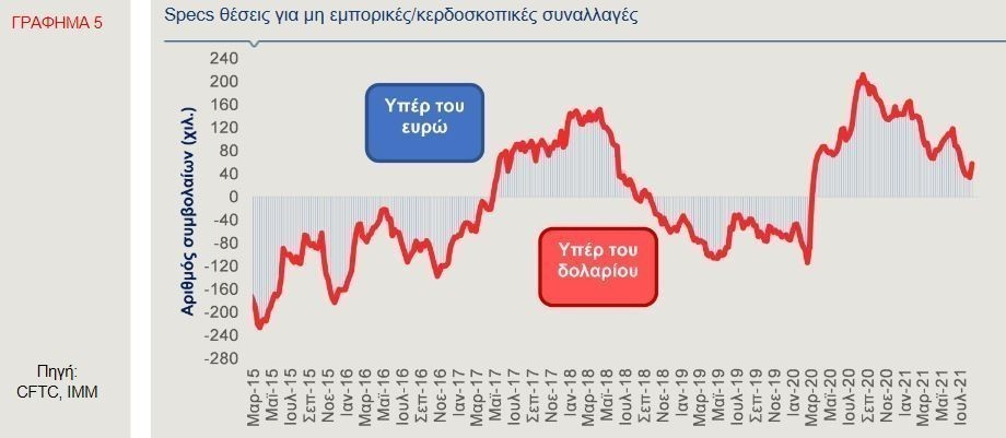 Σύμφωνα με τα στοιχεία του Χρηματιστηρίου του Σικάγου, οι συνολικές καθαρές τοποθετήσεις (αγορές μείον πωλήσεις), στην ισοτιμία του ευρώ με το δολάριο, διατηρήθηκαν θετικές, την εβδομάδα που έληξε στις 17 Αυγούστου. Οι θετικές θέσεις (υπέρ του ευρώ, ‟long”) αυξήθηκαν κατά 23.783 συμβόλαια, με αποτέλεσμα οι συνολικές καθαρές θέσεις να διαμορφωθούν στα 57.640 συμβόλαια, από 33.857 συμβόλαια, την προηγούμενη εβδομάδα (Γράφημα 5). Σημειώνεται ότι πρόκειται για την πρώτη εβδομαδιαία αύξηση που καταγράφεται από τις 15 Ιουνίου.